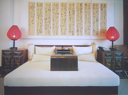 The study area contains a low-level, custom-made sofa dressed in white fabric. On top is a compact wooden table in the style of those once used on traditional opium beds. The calligraphy panels were picked up in a street market in Chengdu; a pair of red silk and wook 1930s art deco lamps placed on a pair of painted chests enhances the opium den theme. Symmetry and order define this tableau.